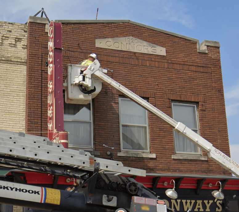 I love it when the Google StreetCar actually catches something good happening — in September, the Cozy Inn sign in Janesville, WI was being restored: