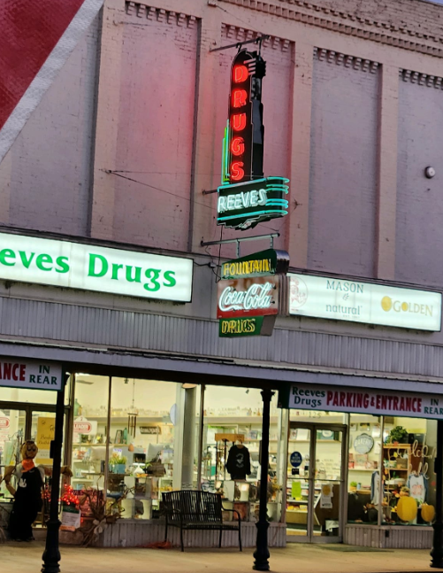 The Reeves Drugs signs in Pulaski, TN were missing at StreetView — but I was able to poke around to discover they were restored in August. From Reeves FB page: