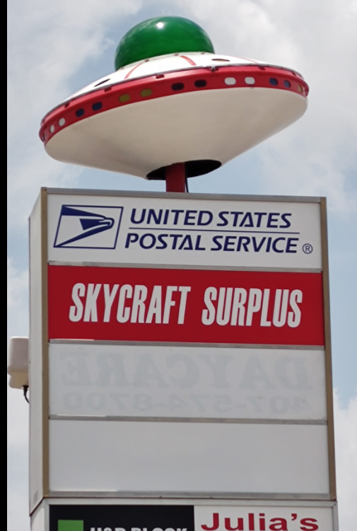 Skycraft Surplus made the move from Winter Park, FL to Orlando, FL in 2021. The UFO that was over the entrance at the original location was restored and installed on top of the shopping center sign in Orlando. StreetView hasn’t been there yet but this photo from Skycraft’s website shows it right after it was installed in June: