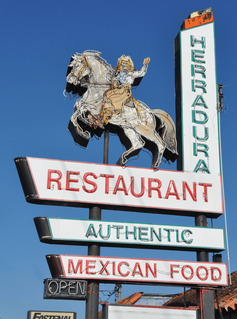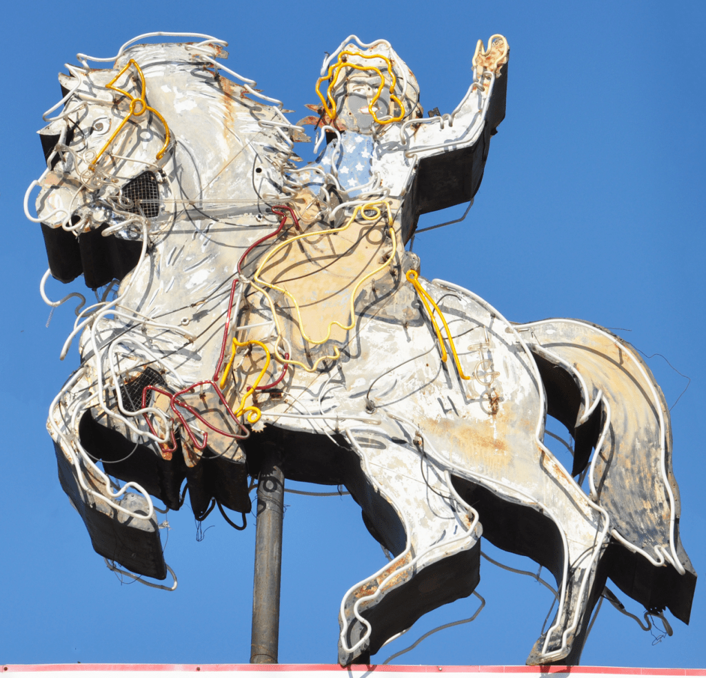 In 2020, the name was changed again but the horse and rider’s neon was restored. Fast forward to last year. A new name and all the neon removed. All plastic letters and the horse and rider poorly painted: