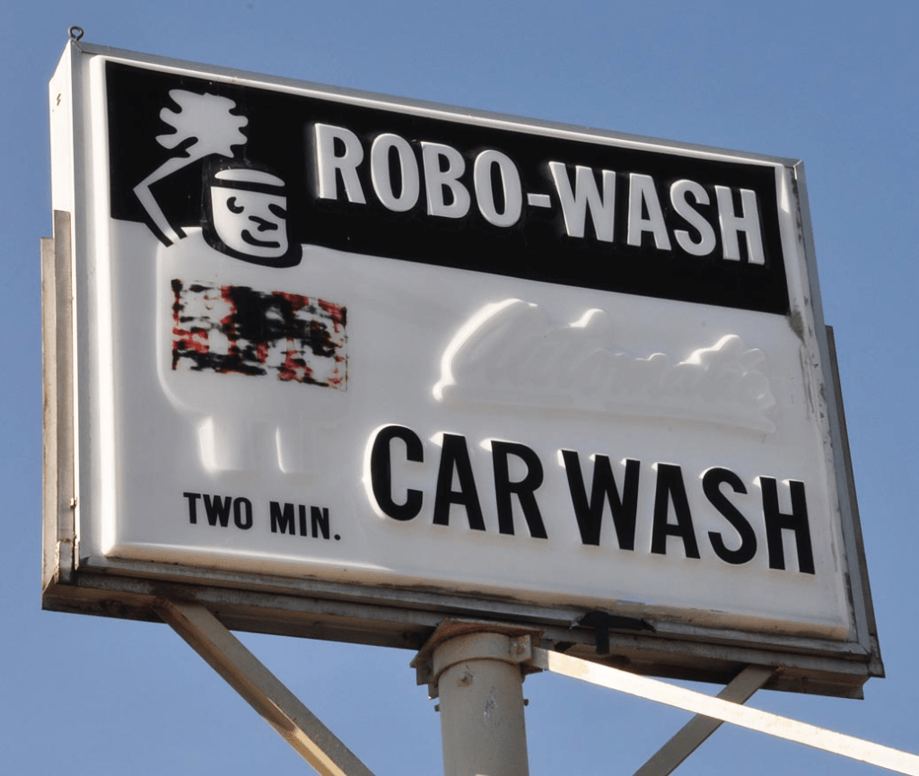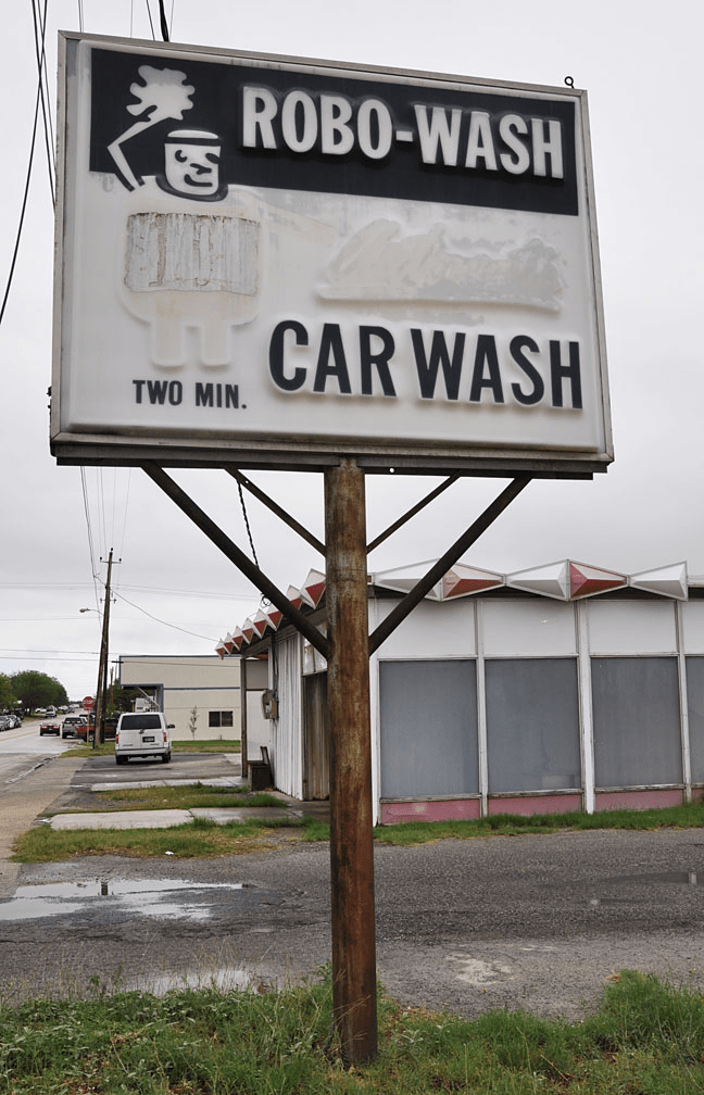 What I believe were the last two Robo-Wash signs are gone now. I believe their robots that went around the oval tracks and washed your car are also gone. But their buildings with the red and white diamond plastic panels remain. Del Rio, TX: