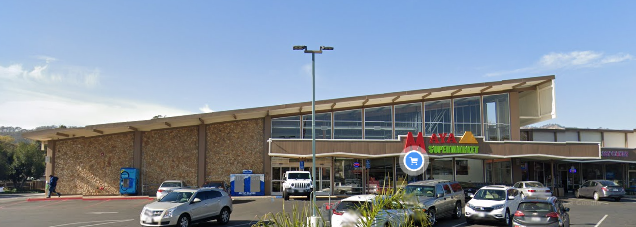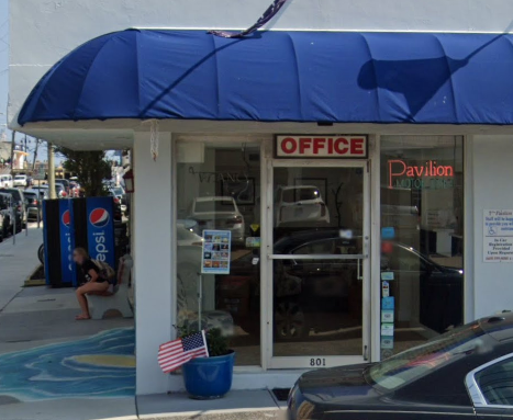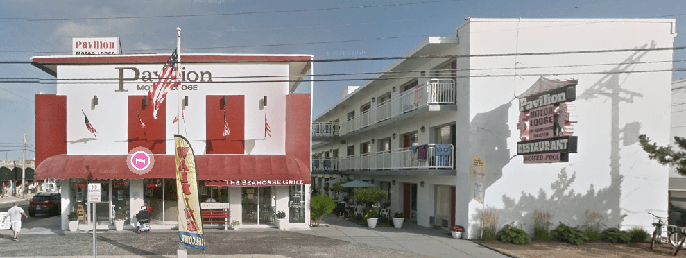 StreetView from 2018 — note the rooftop sign on the left, the Seahorse Grill canopy, the Pavilion painted on the facade, and the neon sign on the right: