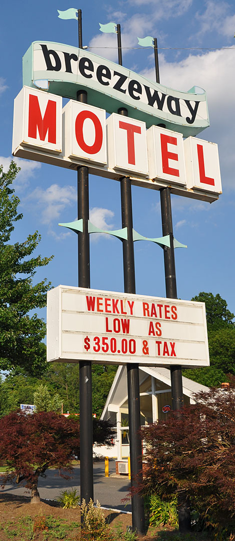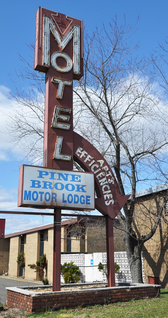 This sign in Pine Brook, NJ is definitely gone and so is the motel property — a huge vacant lot now: