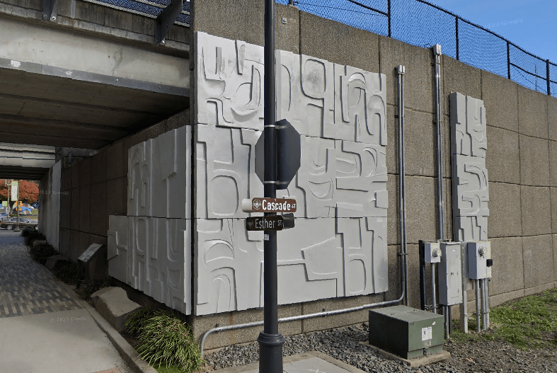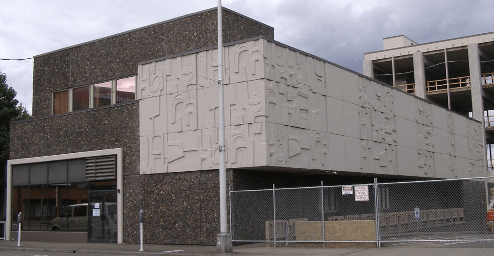 The Clark County Title Company building in Vancouver, WA with its sculpted concrete panels is gone now. The city saved 32 of the panels and put them in storage with plans to display them as public art someday. Some nice vintage photos of the building and panels here: