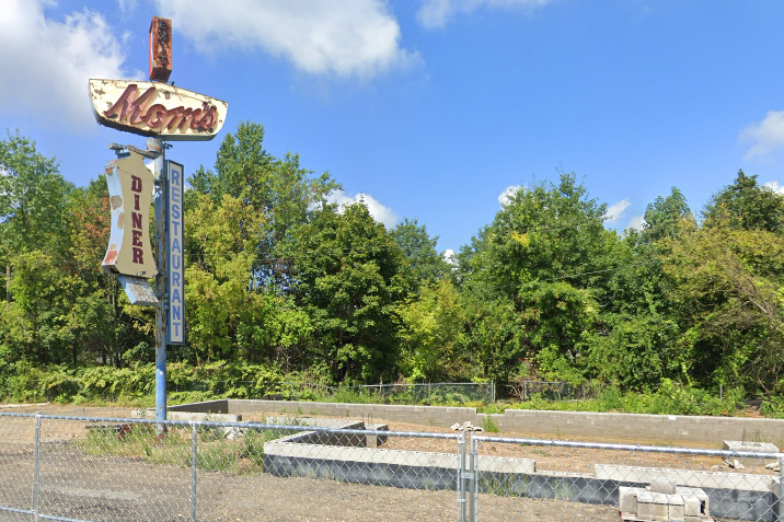 Mom’s Diner (originally Mom’s Peppermill Restaurant) in Hightstown, NJ closed in 2007 and was demolished last year. The rickety sign is still there. The “Diner” panel was once an animated peppermill and the top panel reading “Exit” and “8” revolved. I don’t know if whatever gets built here will adapt the sign. This is the best I can find for the original look: